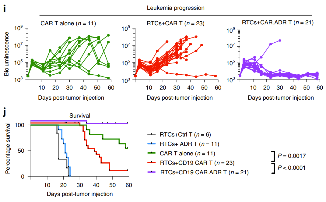 研究者还在动物免疫排斥模型的基础上建立了B细胞淋巴瘤模型。他们发现,在没有受体T细胞RTCs(即免疫排斥反应)存在的情况下,CD19 CAR T细胞在大多数小鼠中能够消除预先建立的肿瘤并持续较长时间。然而,在存在RTCs的情况下,CD19 CAR T细胞在95%动物模型中迅速被排斥,导致外周血中RTCs的扩增,CD19 CAR-T细胞治疗仅在短时间内发挥抗肿瘤效果,随后几乎所有小鼠的癌症迅速复发,且最终死亡。但在CAR ADR T细胞治疗中,RTCs处理的小鼠外周血中CAR T细胞得到显著的增殖,同时观察到RTCs表现出明显的抑制,这种治疗方法充分控制了淋巴癌的进展,小鼠的生存期相较其它组显著延长(图5)。
